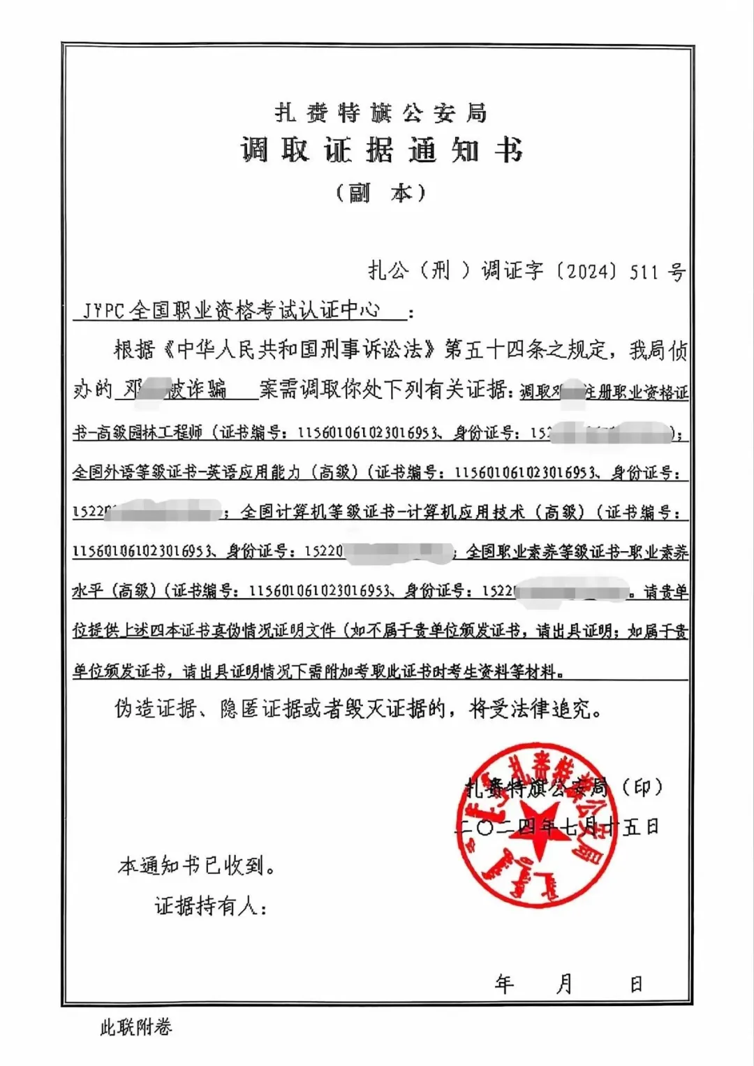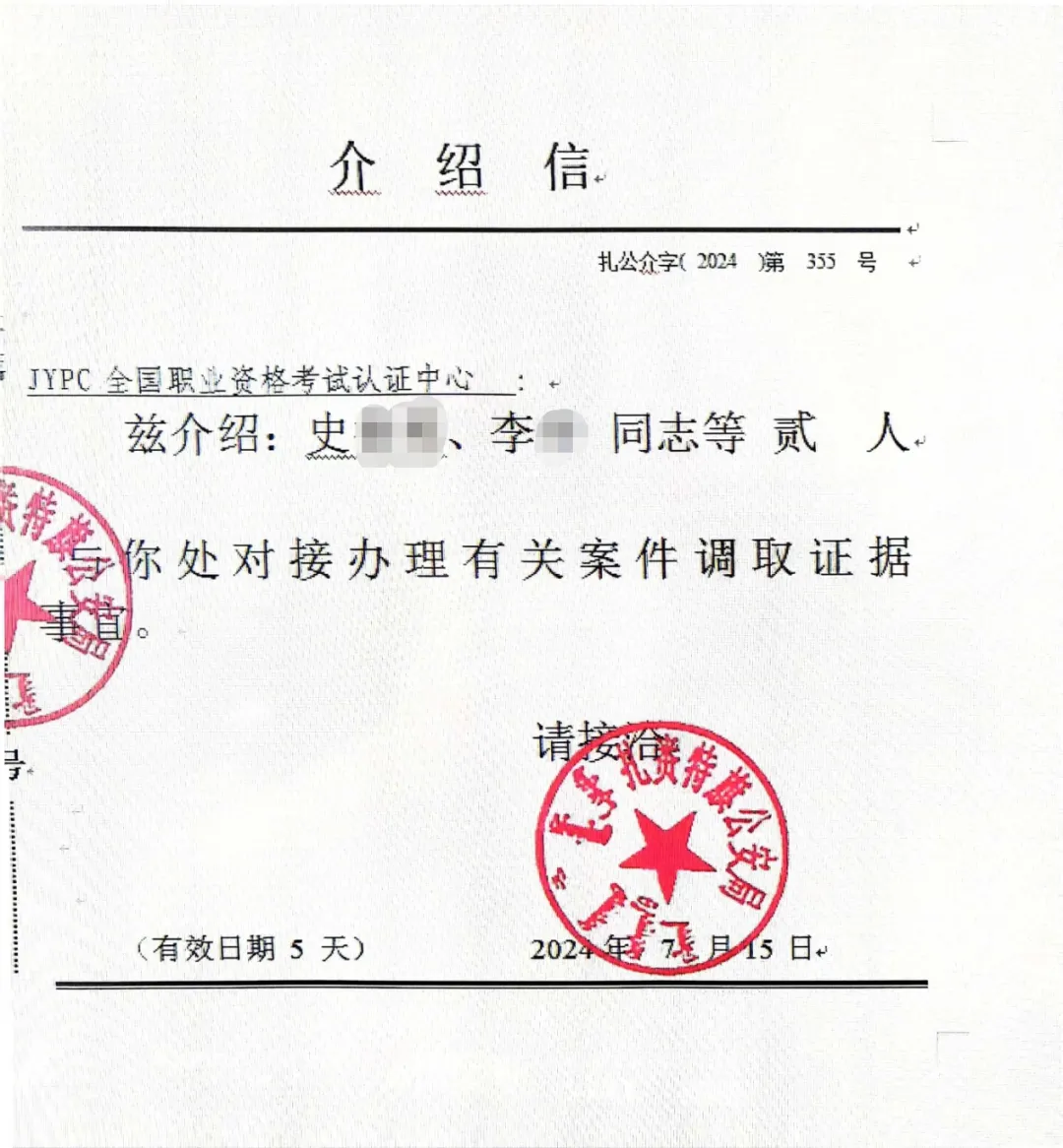 警方调查进一步确认JYPC全国职业资格考试认证中心的真实性和可信度