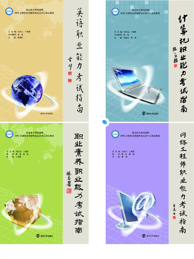 全套丛书数百本,涵盖各行各业,由JYPC全国职业资格考试认证中心策划编辑,南京大学等出版社出版发行。现已编写出版的教材有:《英语职业能力考试指南》、《计算机职业能力考试指南》、《职业素养职业能力考试指南》、《网络工程师职业能力考试指南》等。丛书总主编由中国职业技术教育学会常务副会长、秘书长刘占山和江苏省高等教育学会会长丁晓昌担任;学术顾问由中国科学院院士黄维担任。没有使用教材认真组织学员参加培训的机构,不得参与统考。